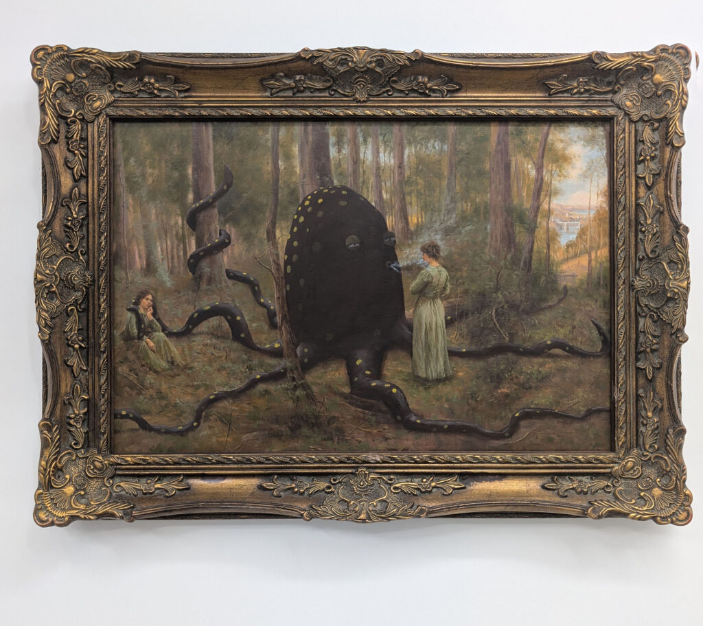 Oil on canvas. Painted on a reproduction of “The Pioneer” by Frederick McCubbin 1904. Part of the collection of the National gallery of Victoria.