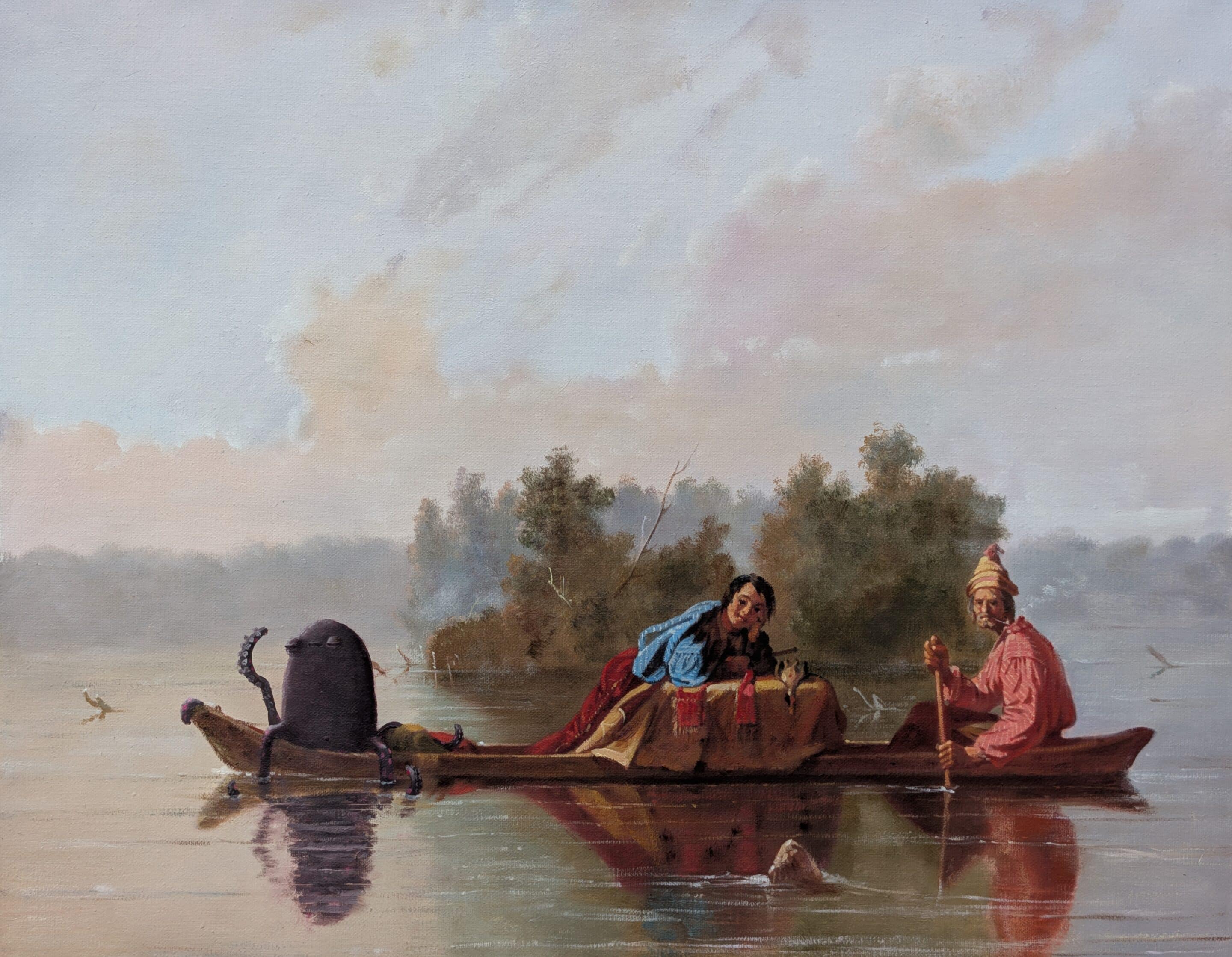 Painted on a reproduction of “Fur Traders descending the Missouri” by George Caleb Bingham, 1843. Presented in a gold frame.